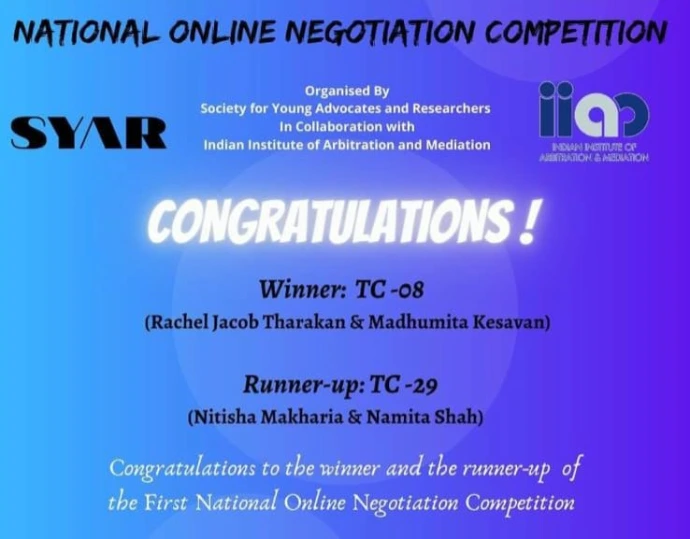 The Inaugural Edition of the National Negotiation Competition was organized by the Society for Young Advocates and Researchers (SYAR India) in collaboration with the Indian Institute of Arbitration and Mediation (IIAM), marking the beginning of a platform dedicated to fostering excellence in negotiation and ADR practices.