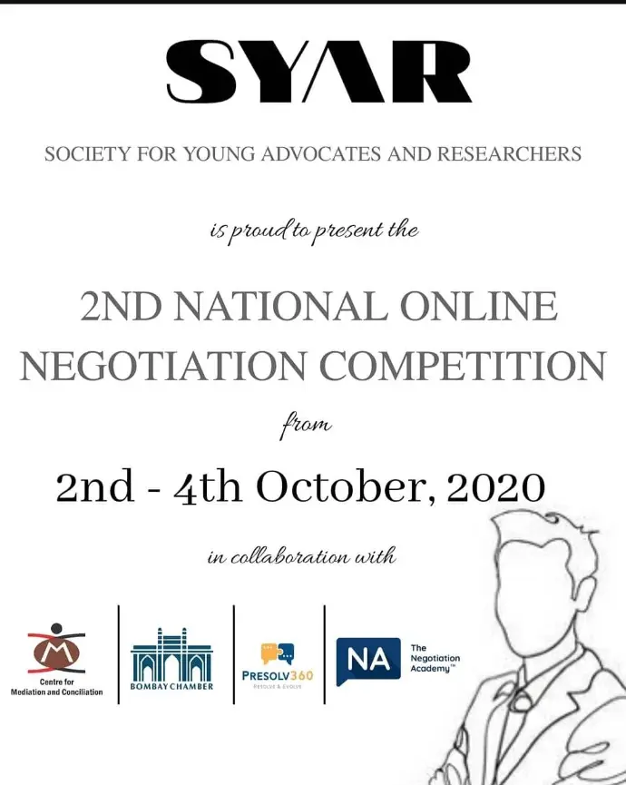 The 2nd National Negotiation Competition saw participation from 32 teams and was organized in collaboration with Presolv360, CAMP Mediation, SCC OnLine, Eastern Book Company, the Association of Mediation Practitioners (AMP Mediation), and Negotiation Academy. Government Law College, Mumbai, emerged as the winner, with Gujarat National Law University finishing as the runner-up. Rajiv Gandhi National Law University, Patiala, was adjudicated as the Best Team in the Preliminary Round. The final round was judged by Mr. Tom Valenti, Mr. Andrew Miller KC, Ms. Mumtaz Bhalla, Mr. Anish Wadia, and Mr. Samit Shah.