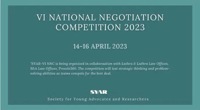 The 6th National Negotiation Competition showcased strong skills in strategy, communication, and problem-solving. Christ University, Bangalore, won the competition, with Campus Law Centre, Delhi University, as the runner-up. Vivekananda Institute of Professional Studies, New Delhi, was adjudicated as the Best Negotiation Team in the Preliminary Round. The event was organized in collaboration with Luthra and Luthra Law Offices and S&A Law Offices. The final rounds were judged by Mr. Pascal Comvalius, Mr. John Lag, Dr. Harish Narasappa, Mr. Nakul Sachdeva, and Mr. Nilava Banopadhya.