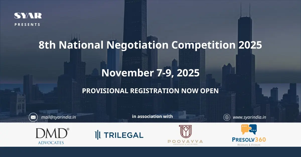 The Society for Young Advocates and Researchers (SYAR India) is dedicated to equipping the next generation of legal professionals with a deep understanding of Alternative Dispute Resolution (ADR) in today’s dynamic environment. Through this platform, SYAR provides law students with a valuable opportunity to develop and refine essential negotiation and mediation skills that are crucial for modern legal practice. Our eighth edition features tailored learning experiences and practical sessions led by accomplished professional mediators, ensuring that participants gain both knowledge and hands-on expertise. As ADR continues to gain prominence in the legal landscape, we are confident that this competition will enhance your learning and support your journey into the professional world. Notably, the previous edition saw Jindal Global Law School winning the competition, setting a high bar for excellence.